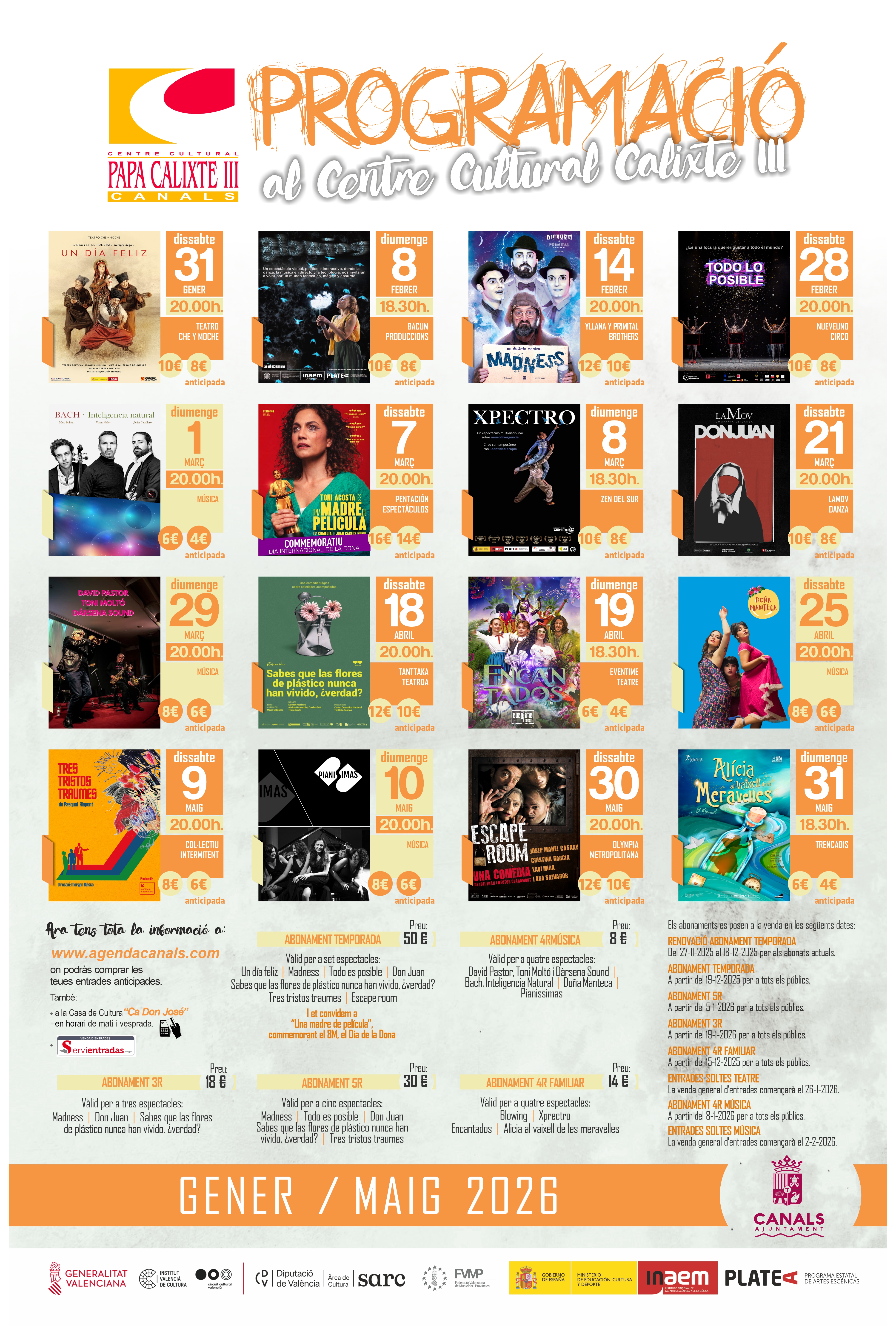 Podeu consultar la programació i els abonaments en els cartells o en la pàgina web www.agendacanals.com